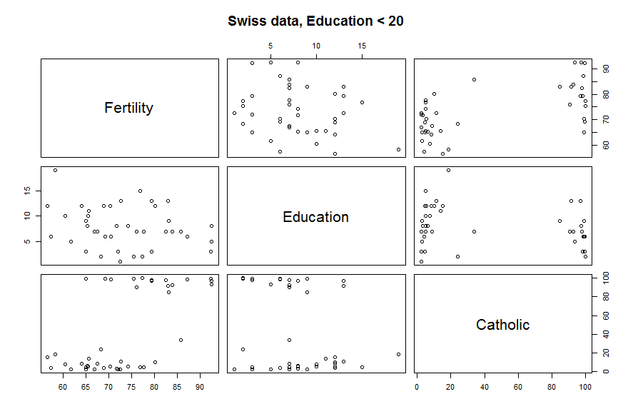 > data(swiss) > pairs(~ Fertility + Education + Catholic, data = swiss, + subset = Education < 20, main = "Swiss data, Education < 20")